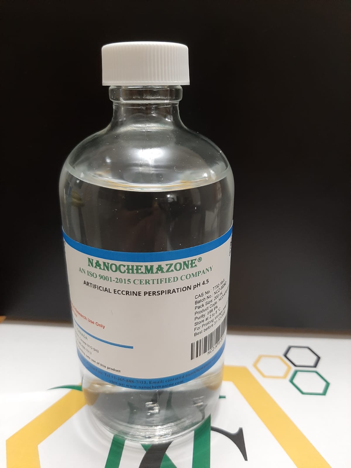 Artificial Eccrine Perspiration we offer is a ready-to-use solution and is the closest mimic to true human eccrine sweat. It consists of nineteen amino acids, the seven most abundant minerals, and the four most abundant metabolites at a pH of 4.5. All concentrations closely match experimentally determined values for adult human eccrine sweat.
